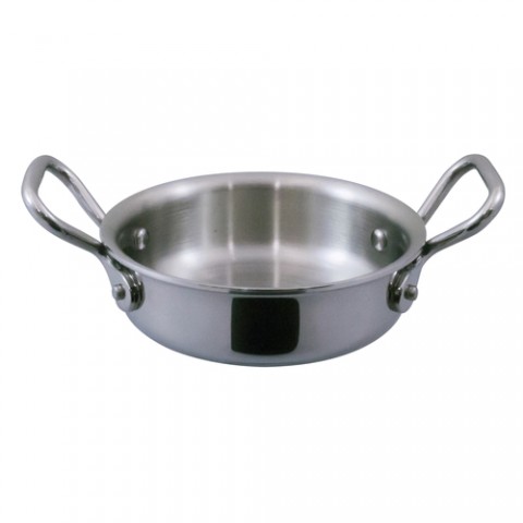 Mini Rondeau Pan, low, 8 oz., 4" dia. x 1-1/4"H, without lid, induction ready, riveted handles, dishwasher safe, tri-ply stainless steel & aluminum, mirror polished finish, Paderno, Mini S/S Cookware