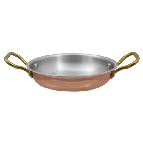 Gratin, 112 oz. (3-1/2 qt.), 11" dia. x 2-1/8"H, round, 3-ply, copper, aluminum and 18/10 stainless steel construction, riveted solid brass handle, induction ready, safe for: gas/electric/radiant heat sources (hand wash only), Paderno, Copper Series 15500