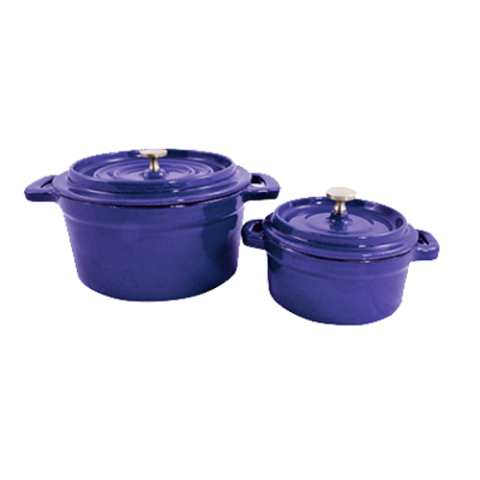 Mini Dutch Oven, 9 oz., 3-5/8" dia. x 1-7/8" deep, round, once enameled cast iron construction, matching lid with heat resistant knob, blue, Paderno, Cookware