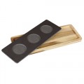 Condiment Holder, 13-1/4" x 4-3/4" x 3/4"H, rectangular with (3) round compartments for holding ramekins, slate can be pre-chilled or heated in the oven up to 700°F to help maintain temperature of food, hand wash only, Acacia wood base, natural, Paderno, Tabletop