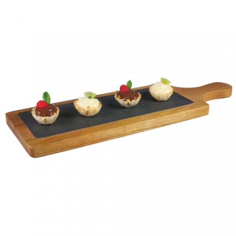 Paddle Board, 17-3/4" x 5-7/8" x 3/4"H, rectangular, slate can be pre-chilled or heated in the oven up to 700°F to help maintain temperature of food, hand wash only, Acacia wood base, natural, Paderno, Tabletop