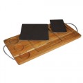 Compartment Board, 20-1/4" x 8-5/8" x 5/8", with handles, 5-compartments: (3) round compartments, (1) square compartments, and (1) rectangular compartment, includes (2) black slate trays, slate can be pre-chilled or heated in the oven up to 700°F to help maintain temperature of food, hand wash only, Acacia wood base, natural, Paderno, Tabletop