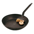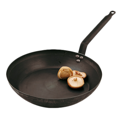 Frying Pan, without lid, 17-3/4" dia. x 3"H, 3/64" to 5/16" thickness, black steel Lyon shaped, flat iron handle affixed with rivets, Paderno, Blue Black & Carbon Steel