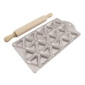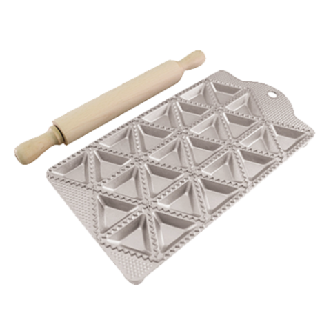 Ravioli Mold Maker, 9-7/8"L x 5-1/8"W x 3/4"H, with beechwood roll pin, makes (24) 1-3/8" triangles, rubber feet, aluminum, Paderno, Ethnic Cuisine