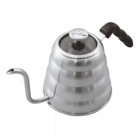 Coffee Maker/Kettle, 1-1/4 qt., 5-5/8" dia. x 5-3/4"H, gooseneck spout, glass lid, integrated thermometer with 0°F to 220°F (0°C to 105°C) temperature range, induction ready, Bakelite handle, 3-ply stainless steel & aluminum base (hand wash only), Paderno, Tabletop