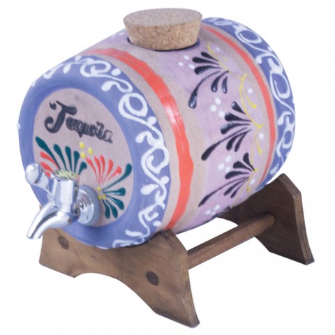 Tequila Barrel, 1 gallon, 5-1/2" dia. x 6-7/8"L, with wood stand, splash-free spigot, cork bung opening, lead-safe, hand-wash only, ceramic/clay barrel, hand-painted, Paderno, Ethnic Cuisine