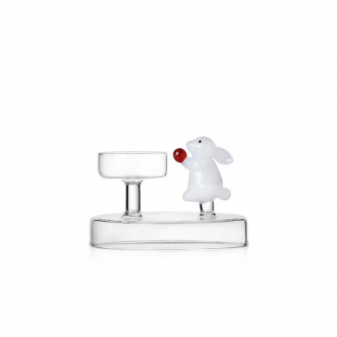 Tealight, 4.3" dia. x 3"H, dishwasher safe at low temperatures, borosilicate, white rabbit with berry, Ichendorf, Alice
