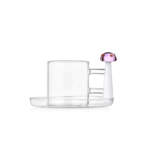 Coffee Cup & Saucer, 3.4 oz., 2.17/4.33" dia. x 2.8"H, dishwasher safe at low temperatures, borosilicate, pink mushroom with red dots, Ichendorf, Alice