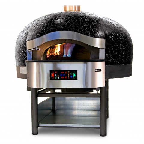 Morello Forni Rotary Wood/Gas Combo Fired Pizza Oven, hybrid (operates gas only, wood only, or combination wood & gas), 39" inside cooking diameter, rotating cooking deck, touch screen electronic control system, (6-7) 8", (5-6) 10", (4-5) 12", (1-2) 16" pizza capacity, 7” thick sealed insulated walls, dual burners system (internal dome burner & under deck, emergency stop button, premium grade alumina with heavy metal enclosure, mosaic cupola, 220v/60/1-ph, 136,000 BTU, NSF, UL