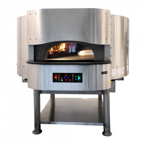 Morello Forni Rotary Wood/Gas Combo Fired Pizza Oven, hybrid (operates gas only, wood only, or combination wood & gas), 47" inside cooking diameter, rotating cooking deck, touch screen electronic control system, (9-10) 8", (8-9) 10", (7-8) 12", (3-4) 16" pizza capacity, 7” thick sealed insulated walls, dual burners system (internal dome burner & under deck, emergency stop button, high refractory premium grade alumina with heavy metal enclosure, stainless steel finish, 220v/60/1-ph, 136,000 BTU, NSF, UL