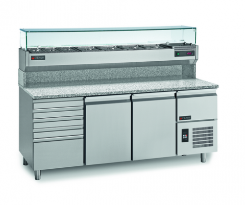 Refrigerated Pizza Prep Table with Upper Refrigerated Toppings Rail Display Case, with independent compressors. Stainless steel construction, with countertop made of Sardinian granite. Three Door lower refrigerator with neutral dough drawer compete with 4 Plastic Dough Trays. Depth of Granite Worktop is 32" Deep with 6" Risers that Support refrigerated ingredient holder display case. Each Refrigerated Door Equipped with runners and 1 shelf. Includes Stainless Steel Toppings Pans for Upper Display. 115V, ETL Certified.