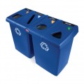 Glutton® Recycling Station, 53"W x 23-1/2"D x 35-3/10"H, holds up to 92 gallons, includes: (2) Glutton® 56 gallon containers, (4) Slim Jim® 23 gallon containers, (1) hinged lid frame, (8) restrictive-opening tops (4 circles, 2 paper slots, 1 square, 1 triangle), (1) label pack (symbol and word labels in English, French, and Spanish), blue, Made in USA