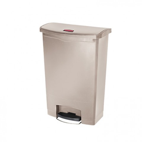 Slim Jim® Utility Container, 24 gallon (90 liter), 22-7/16"W x 13-7/8"D x 32-1/2"H, slim profile, internal hinged lid, includes: liner retainer band, front step-on pedal, small footprint, indoor, resin, beige, FM approved, meets OSHA & OBRA standards (dual rigid stream liner sold separately), Made in USA (16 week lead time)