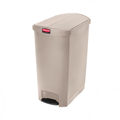 Slim Jim® Utility Container, 24 gallon (90 liter), 25-3/32"W x 15-7/8"D x 32"H, slim profile, internal hinged lid, end step-on pedal, small footprint, indoor, resin, beige, FM approved, meets OSHA & OBRA standards, Made in USA (16 week lead time)