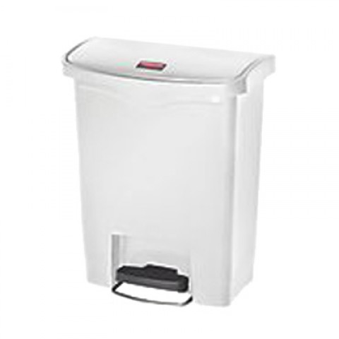 Slim Jim® Utility Container, 8 gallon (30 liter), 16-47/64"W x 10-21/32"D x 21-7/64"H, slim profile, internal hinged lid, includes: liner retainer band, front step-on pedal, small footprint, indoor, resin, white, FM approved, meets OSHA & OBRA standards (dual rigid stream liner sold separately), Made in USA (16 week lead time)