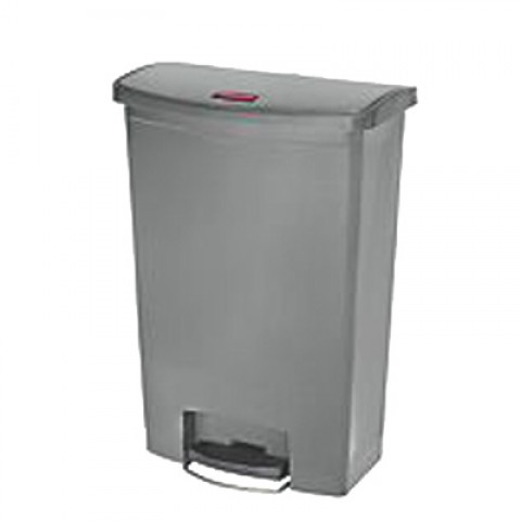 Slim Jim® Utility Container, 24 gallon (90 liter), 22-7/16"W x 13-57/64"D x 32-1/2"H, slim profile, internal hinged lid, includes: liner retainer band, front step-on pedal, small footprint, indoor, resin, gray, FM approved, meets OSHA & OBRA standards (dual rigid stream liner sold separately), Made in USA (16 week lead time)