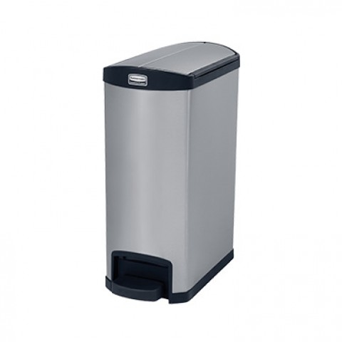 Slim Jim® Utility Container, 13 gallon (50 liter), 22-43/64"W x 11-39/64"D x 28-55/64"H, slim profile, internal hinged lid, end step-on pedal, fingerprint resistant, small footprint, indoor, stainless steel, black, FM approved, meets OSHA & OBRA standards (dual stream rigid liner sold separately) (16 week lead time)