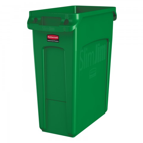 Slim Jim® Container, 16 gallon, 22"L x 11"W x 25"H, with venting channels, molded-in handles, general purpose waste, open type without lid, high-impact plastic construction, green, Made in USA