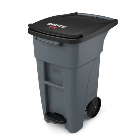 BRUTE® Step-On Rollout Container, 32 gallon capacity, with hinged lid, ergonomic rear handle, compliant with auto-lifters, reinforced rim, with UV inhibitor, heavy-duty rear wheels, gray, Made in USA