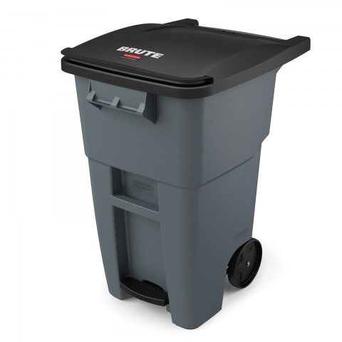 BRUTE® Step-On Rollout Container, 50 gallon capacity, with hinged lid, ergonomic rear handle, compliant with auto-lifters, reinforced rim, with UV inhibitor, heavy-duty rear wheels, gray, Made in USA