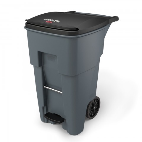 BRUTE® Step-On Rollout Container, 65 gallon capacity, with hinged lid, ergonomic rear handle, compliant with auto-lifters, reinforced rim, with UV inhibitor, heavy-duty rear wheels, gray, Made in USA