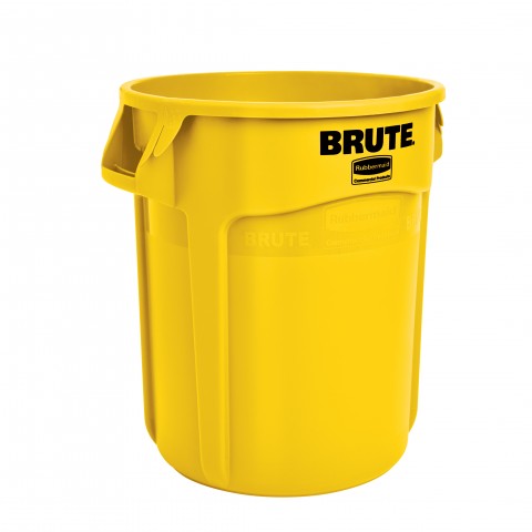 ProSave® BRUTE® Container, without lid, 10 gallon, round, 15-5/8"D x 17-1/7"H, reinforced rims, built in handles, double rimmed base, high-impact plastic construction, yellow, NSF, Made in USA (contact Rubbermaid for broken case information)