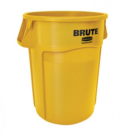 BRUTE® Container, without lid, 44 gallon, 24"D x 31-1/2"H, reinforced rims, built in handles, double rimmed base, high-impact plastic construction, yellow, NSF, Made in USA (contact Rubbermaid for broken case information)