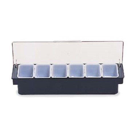Condiment Dispenser, (6) 1 pint inserts, 19-5/8"W x 6-1/4"D x 3-3/4"H, drop-in, see-thru lid, finger tab, dishwasher safe, polycarbonate, black, S.O.S. (Special Order Smallwares) product; see SOS document for details, Made in USA (CANNOT BREAK CASE)