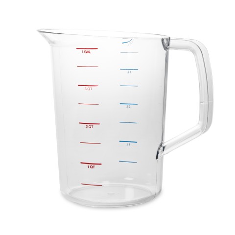 Bouncer® Measuring Cup, 4 quart, -40°F/-40°C to 212° F/100°C temperature range, measurement markings in red & blue, break resistant polycarbonate, clear, NSF, Made in USA (contact Rubbermaid for broken case information)