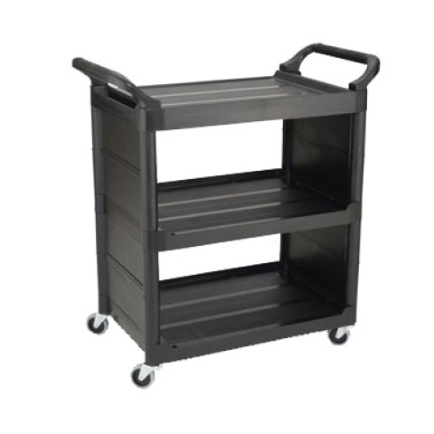Utility Cart, 33-5/8"L x 18-5/8"W x 36-3/4"H, (3) shelves, smooth surface, handles, end panels, plastic construction, (4) 3" swivel casters, assembly required, black, HACCP, Made in USA