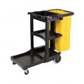 Cleaning Cart, 46"L x 21-3/4"W x 38-3/8"H, 5 cu.ft. storage capacity, front platform holds WaveBrake® mop bucket or up to a 32-gallon BRUTE® container, (2) 10 qt. yellow carry caddies, (11) standard tool grip & vacuum holders, (2) safety sign hooks, 34-gallon waste/recycling bag, zippered leak-proof bag for trash removal, comfort-grip handle, (2) non-marking 8" rigid wheels & (2) 4" swivel casters, aluminum & structural web plastic, black, Made in USA
