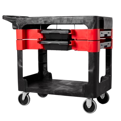 Trades Cart, 38"L x 19-1/4"W x 33-3/8"H, (2) shelves, open base, (2) parts boxes,(4) parts bins, 180 lb. top shelf capacity, 150 lb. bottom shelf capacity, (4) 5" casters, assembly required, black, Made in USA