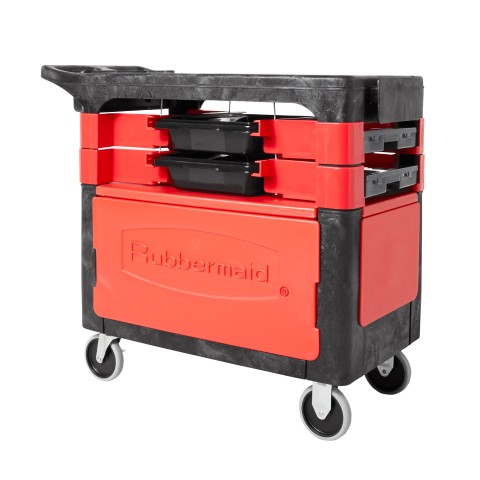 Trades Cart, 38"L x 19-1/4"W x 33-3/8"H, (2) shelves, (1) compartment, (2) parts boxes, (4) parts bins, with locking cabinet, 180 lb. top shelf capacity, 150 lb. bottom shelf capacity, (4) 5" casters, assembly required, black, Made in USA