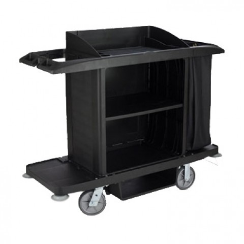 Xtra™ Housekeeping Cart, 60"L x 22"W x 50"H, full size cart with vinyl bag, vacuum holder, under deck shelf, rotating non-marking bumpers, assembly required, black, Made in USA