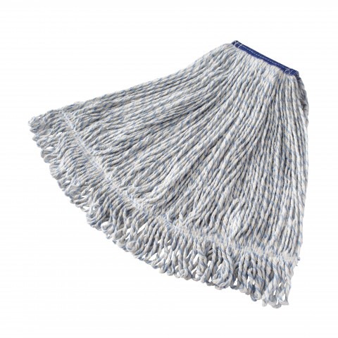 Super Stitch® Finish Mop Head, large, 4-ply yarn, 1" headband, looped end, for applying chemicals, white with blue stripes, Made in USA