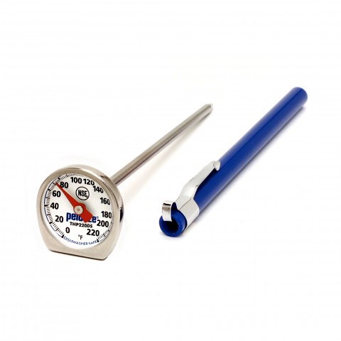 Pelouze® by Rubbermaid Food Preparation Thermometer, pocket, 1" dial, 5" stem, includes blue plastic sheath with pocket clop, field calibration, anti-roll design, shatterproof, temperature range 0° to 220°F, 304 stainless steel, NSF (CANNOT BREAK CASE)