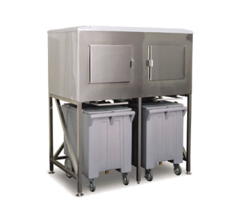 Ice Express Transport System, side-hinged front door & (2) bays for (2) roll under carts (included), 1327 lb ice storage capacity, for top-mounted ice maker, stainless steel exterior, polyurethane insulation, polyethylene liner, NSF, engineered and assembled in USA, includes universal bin adapter for most applications, includes paddle with hanger