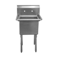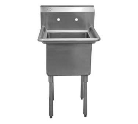Heavy Duty Series Sink, one compartment, 23"W x 24"D x 45-1/2"H, 16/304 stainless steel, 18" wide x 18" front-to-back x 14" deep compartment, 10-1/2"H backsplash, 8" OC splash mount faucet holes, 3-1/2" basket strainer included, stainless steel gussets, galvanized legs with adjustable bullet feet, NSF