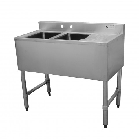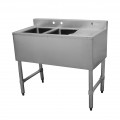 Underbar Sink, two compartment, 26"W x 18-3/4"D x 33"H,10"W x 14"D, 18/304 stainless steel, 10" wide x 14" front-to-back x 10" deep compartments, 3"H backsplash, 4" OC splash mount faucet holes, 20/304 stainless steel apron on front & sides, 1-1/2" drains, galvanized steel legs & side crossbracing with adjustable bullet feet, NSF