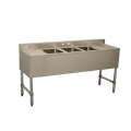 Underbar Sink, three compartment, 72"W x 18-3/4"D x 33"H, 18/304 stainless steel, 10" wide x 14" front-to-back x 10" deep compartments, 19" drainboards on left & right, 3"H backsplash, 4" OC splash mount faucet holes, 20/304 stainless steel apron on front & sides, 1-1/2" drains, galvanized steel legs & side crossbracing with adjustable bullet feet, NSF