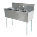Serv-Ware - Sinks - 57" Budget Sink 3 Bowls - Dimensions: 57" W x 24.5" D x 41" H, 18/430 stainless steel, (3) 18" wide x 21" front-to-back x 13" deep compartments, 9"H backsplash, 8" OC splash mount faucet holes, galvanized legs with adjustable plastic bullet feet, includes basket strainers