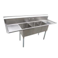 Economy Series Sink, three compartment, 84"W x 25-1/2"D x 45-1/2"H, 18/304 stainless steel, (3) 16" wide x 20" front-to-back x 12" deep compartments, 18" drainboards on left & right, 11-3/4"H backsplash, 8" OC splash mount faucet holes, raised rolled edges on front & sides, 3-1/2" basket drains with 1-1/2" outlets, stainless steel gussets, galvanized legs with adjustable plastic bullet feet, NSF