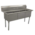Economy Series Sink, three compartment, 50"W x 20-1/2"D x 45-1/2"H, 18/304 stainless steel, 15" wide x 15" front-to-back x 14" deep compartments, 11-3/4"H backsplash, 8" OC splash mount faucet holes, raised rolled edges on front & sides, 3-1/2" basket drains with 1-1/2" outlets, stainless steel gussets, galvanized steel legs with adjustable bullet feet, NSF