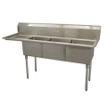 Economy Series Sink, three compartment, 74-1/2"W x 29-1/2"D x 45-1/2"H, 18/304 stainless steel, 18" wide x 24" front-to-back x 14" deep compartments, 18" drainboard on left, 11-3/4"H backsplash, 8" OC splash mount faucet holes, raised rolled edges on front & sides, 3-1/2" basket drains with 1-1/2" outlets, stainless steel gussets, galvanized steel legs with adjustable bullet feet, NSF