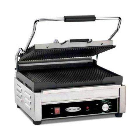 Serv-Ware - Electric Cooking - Single Panini Grill - Grooved Top & Bottom - Dimensions: 16.92" W x 14.56" D x 8.26" H - Temperature Range: 120°F – 570°F - Amps: 15 - Voltage: 115 - Hz: 60 - Phase: 1 - Watts: 1750 - Materials: Stainless steel construction with cast iron plates - Warranty: 6 Months
