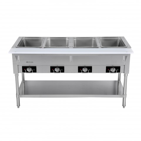 Serv-Ware - Electric Cooking - 4 Open Well Electric Steam Table - Dimensions: 58.2" W x 29.5" D x 33.5" H - Temperature Range: 120°F – 200°F - Amps: 17 - Voltage: 115 - Hz: 60 - Phase: 1 - Watts: 2000 - Materials: Stainless steel construction - Warranty: 1 Year - Parts; 90 Days - Parts & Labor