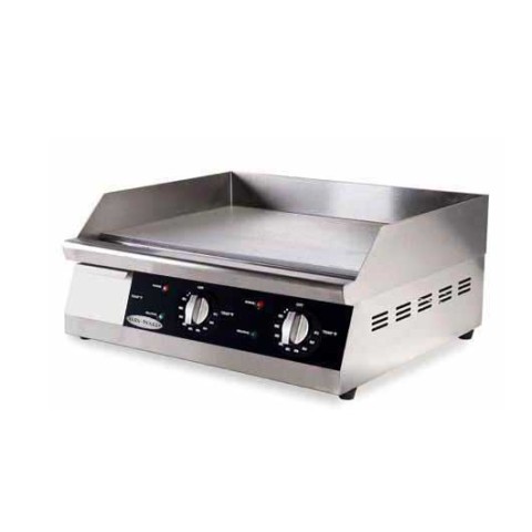 Serv-Ware - Electric Cooking - Thermostatic Griddle - 24.14" W x 19.76" D x 9.40" H, flat griddle surface, 24" x 15.5" cooking surface, .5" thick steel griddle plate, 150°-570°F temperature range, thermostatic controls, power & heat indicator lights, 3" splash guard on sides & rear, removable grease pan, stainless steel construction, 4" adjustable stainless steel legs, cETLus, CE