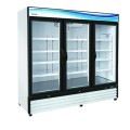 Freezer Merchandiser, three-section, 72 cu. ft. capacity, self-contained bottom mount refrigeration, (3) self-closing glass doors, (4) vinyl coated shelves per section, electronic thermostat, LED digital display, temperatures between -10°F & 0°F, illuminated top panel, stainless steel floor, white powder coated interior & exterior, casters, R290 Hydrocarbon refrigerant, 1-1/4 HP, 208v/60/1-ph, 9.0 amps, NEMA L14-20, cETLus, ETL-Sanitation