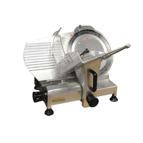 Serv-Ware - Processing - Meat Slicer 12" - single speed, 12" diameter alloy knife, belt drive, safety guard, knife sharpener, adjustable thickness up to 9/16", fan-cooled, thermal overload protection, non-slip feet, anodized aluminum finish, 1/3 HP, CE, cETLus, ETL-Sanitation