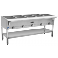 Serv-Ware - Gas Cooking - 5 Bay Gas Steam Table -Natural Gas - 72.39"W x 22.5"D x 33.15"H - (4) open wells (accommodates standard size pans) - individual control valve per well - Cast Iron burners - removable 7" cutting board - stainless steel open base with undershelf